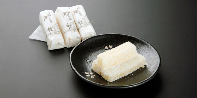 まさに天をささえる柱のごとく、力強く美しい絶景にちなんだ天柱は、厳選した手間をかけて剥いた柚子の皮を、特上の餅粉とともに練り上げた上品な甘さの餅菓子です。